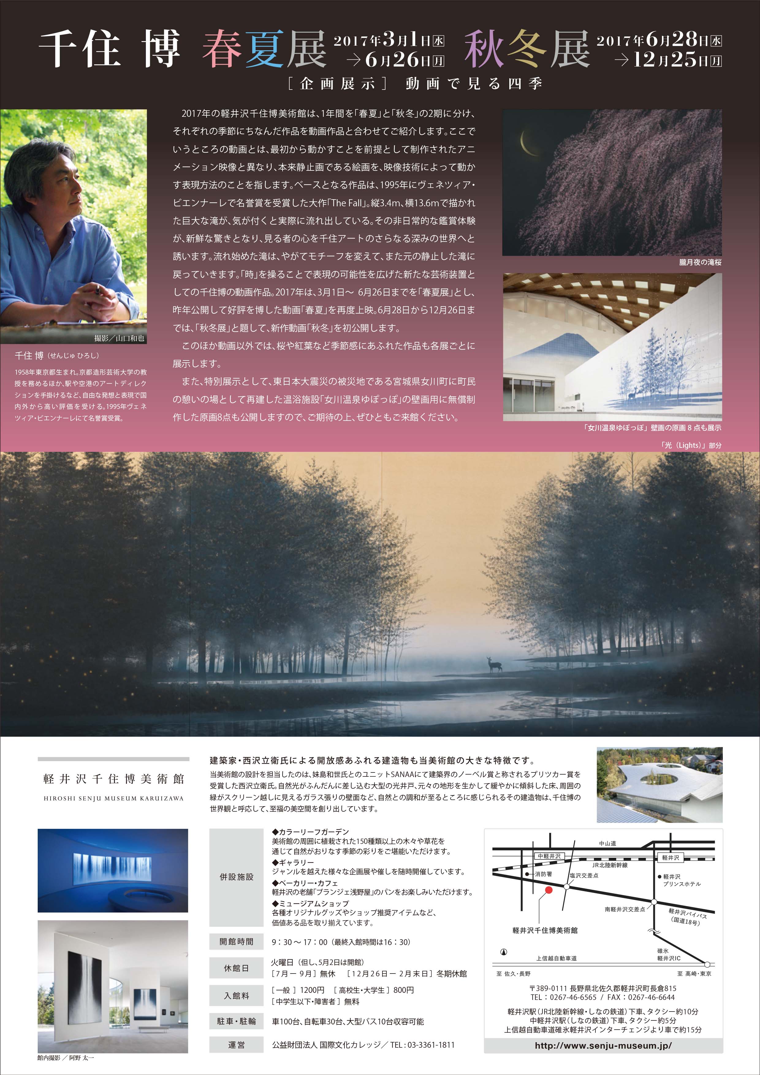 2017年の軽井沢千住博美術館は、1年間を「春夏」と「秋冬」の2期に分け、それぞれの季節にちなんだ作品を動画作品と合わせてご紹介いたします。その第2期となる「秋冬展」では、千住博が1995年にヴェネツィア・ビエンナーレで名誉賞を受賞した大作「The Fall」にプロジェクションマッピングの技術を駆使することで、滝が滝桜や紅葉、そして雪景色へと次第に変化していく最新動画作品「四季」を初公開いたします。また、このほかにも東日本大震災の被災地である宮城県女川町に町民の憩いの場として再建した温浴施設「女川温泉ゆぽっぽ」の壁画用に無償制作した8作品の原画も、「春夏展」に引き続き展示しておりますので、どうぞこの機会にご鑑賞ください。